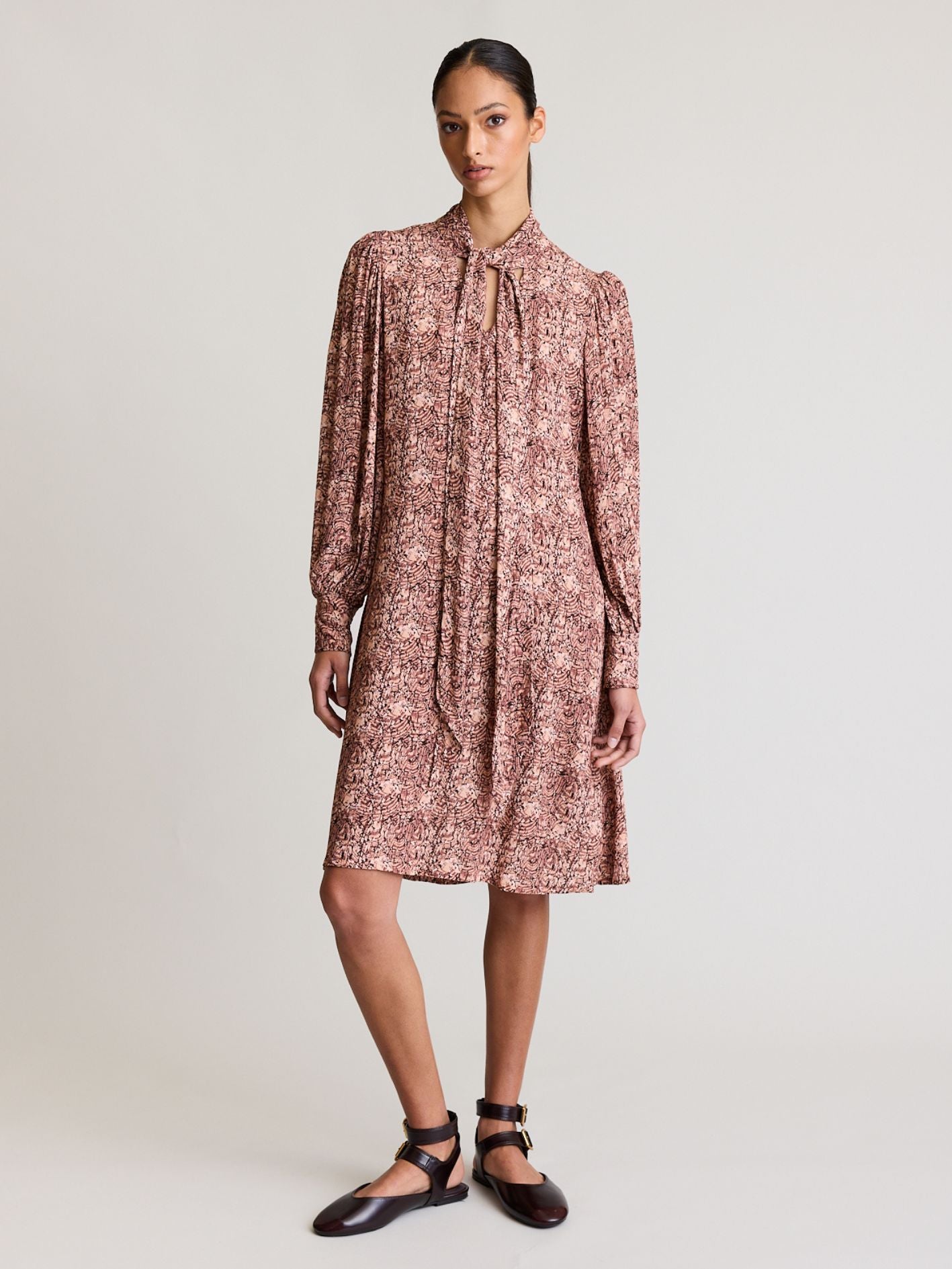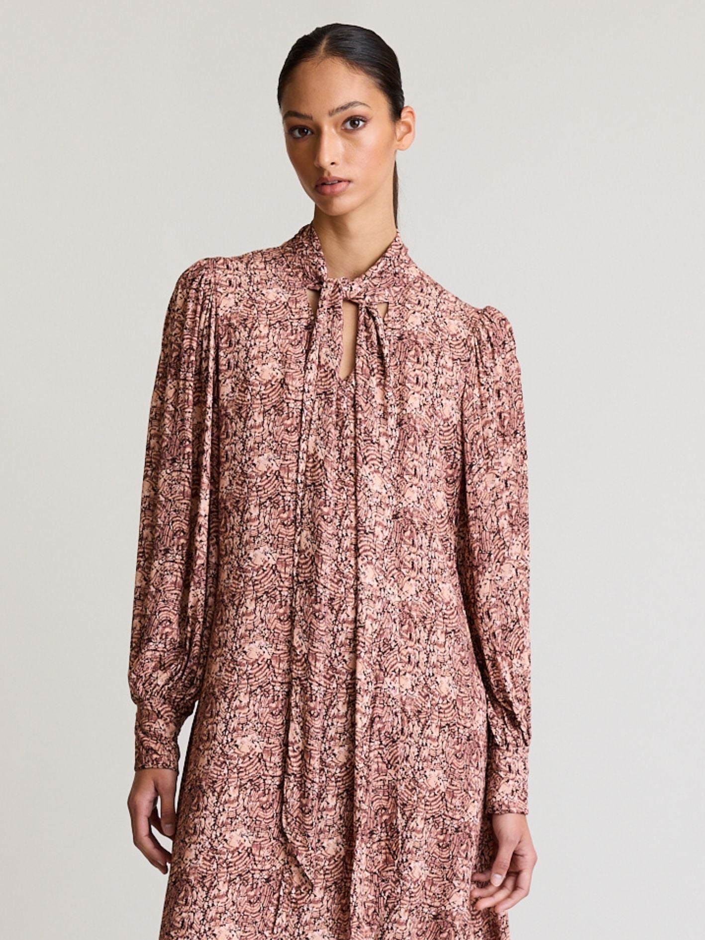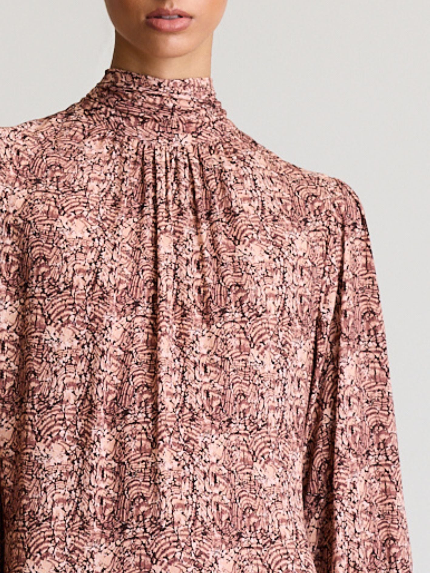 DUAL MINI is our latest offering in elevated everyday wear. Featuring a gathered high neckline, lavallière tie, v cutout detail, our signature blouson sleeves with a unique cuff with a shirred back panel.