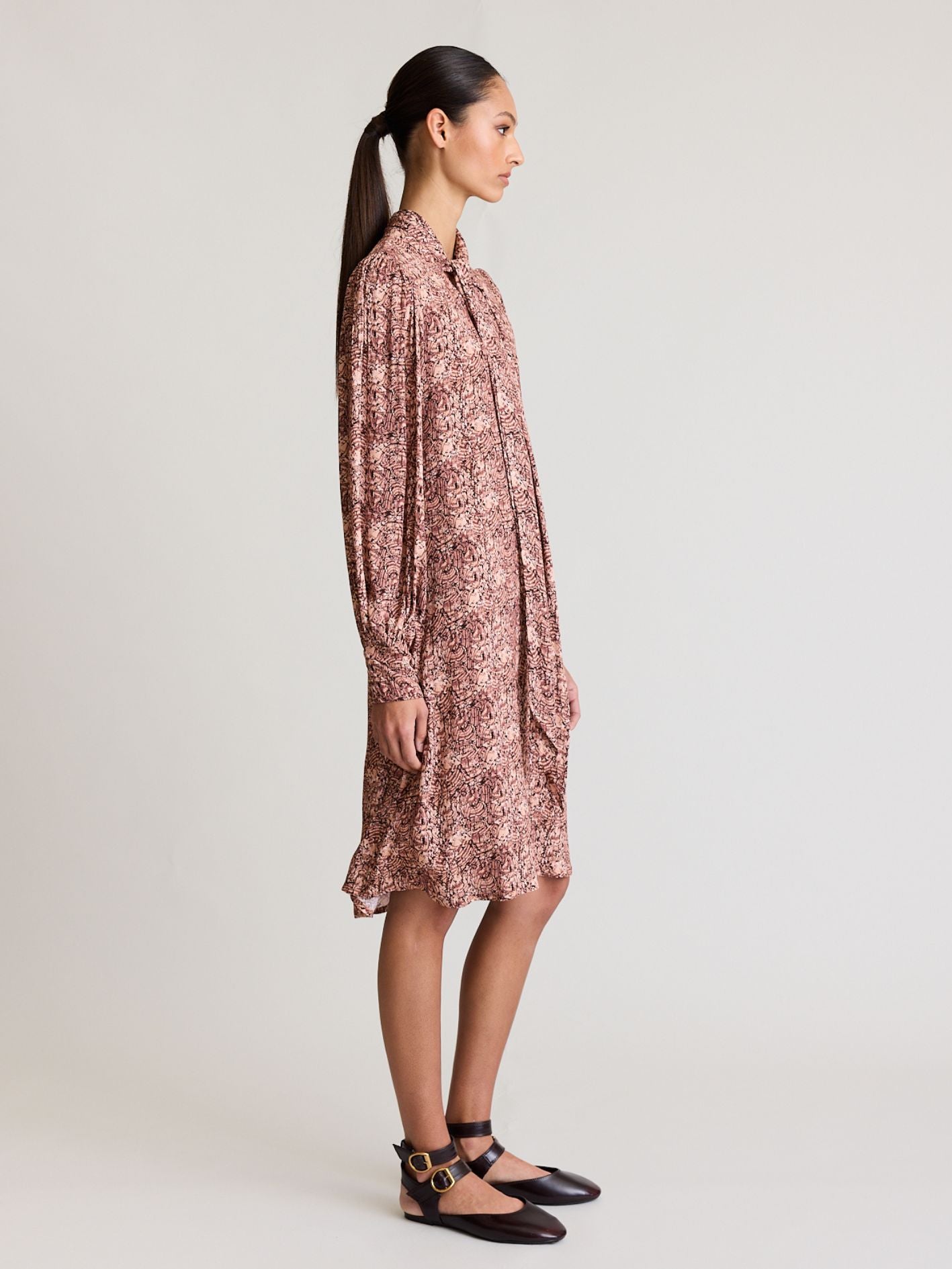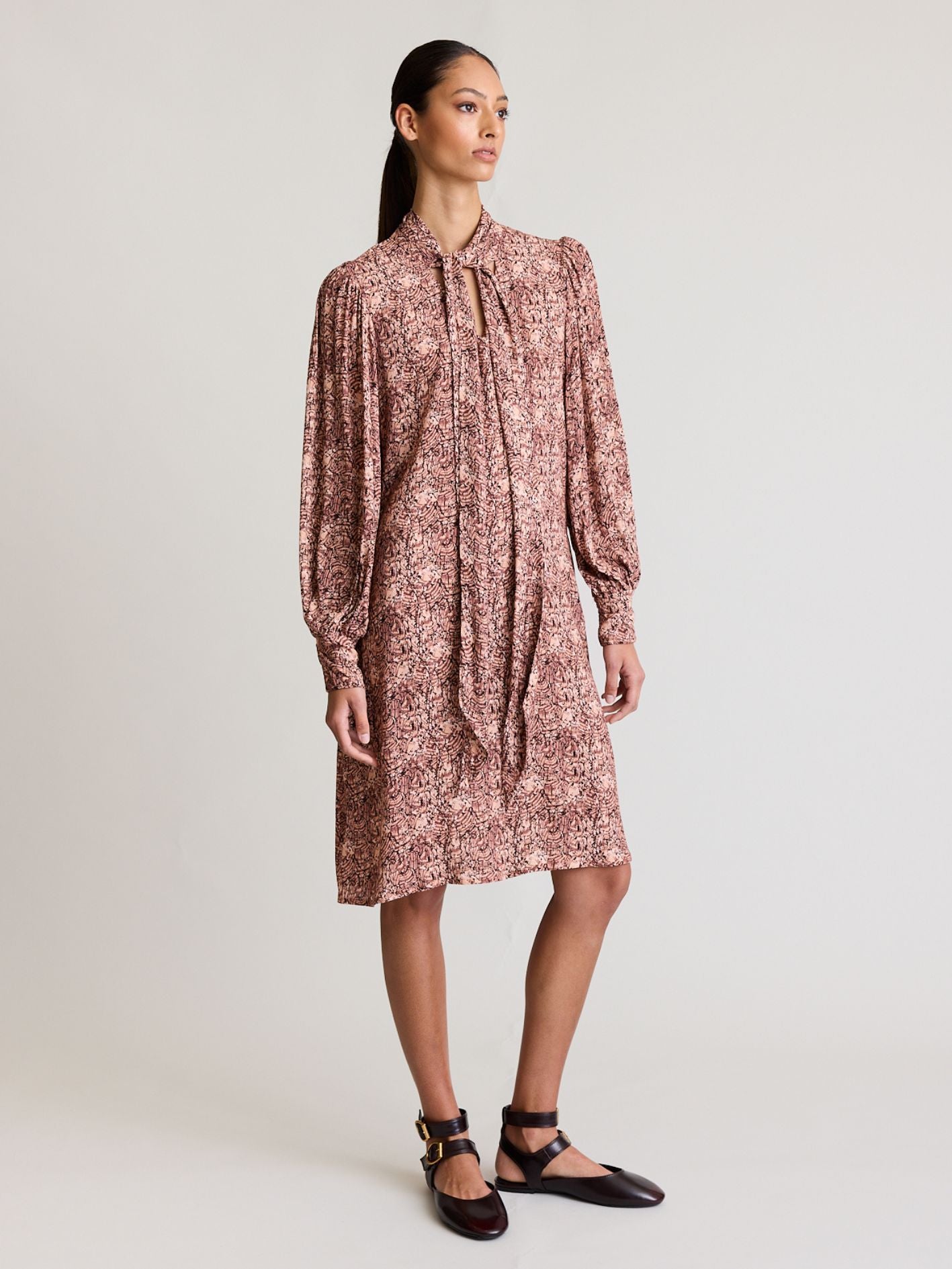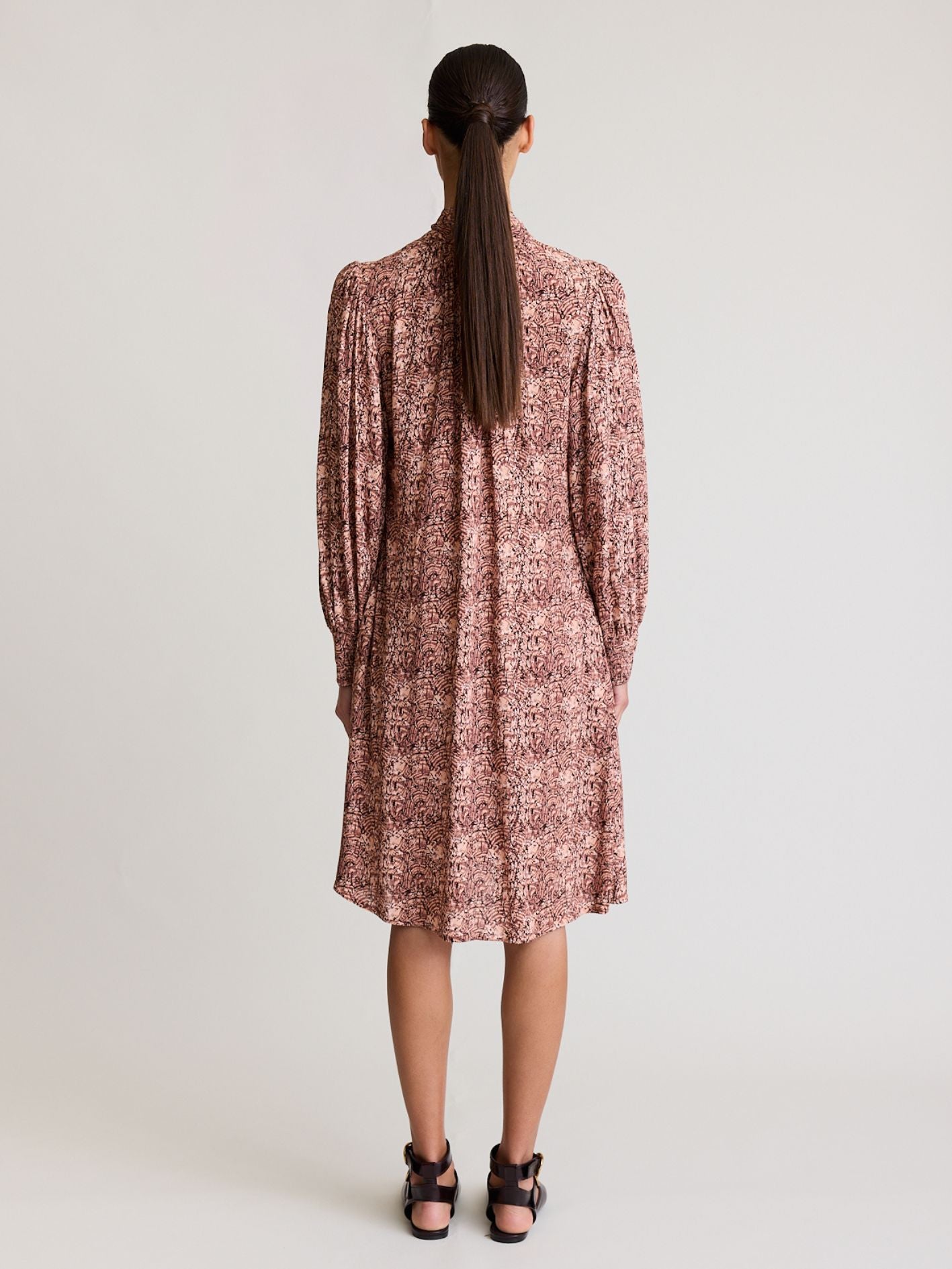 DUAL MINI is our latest offering in elevated everyday wear. Featuring a gathered high neckline, lavallière tie, v cutout detail, our signature blouson sleeves with a unique cuff with a shirred back panel.