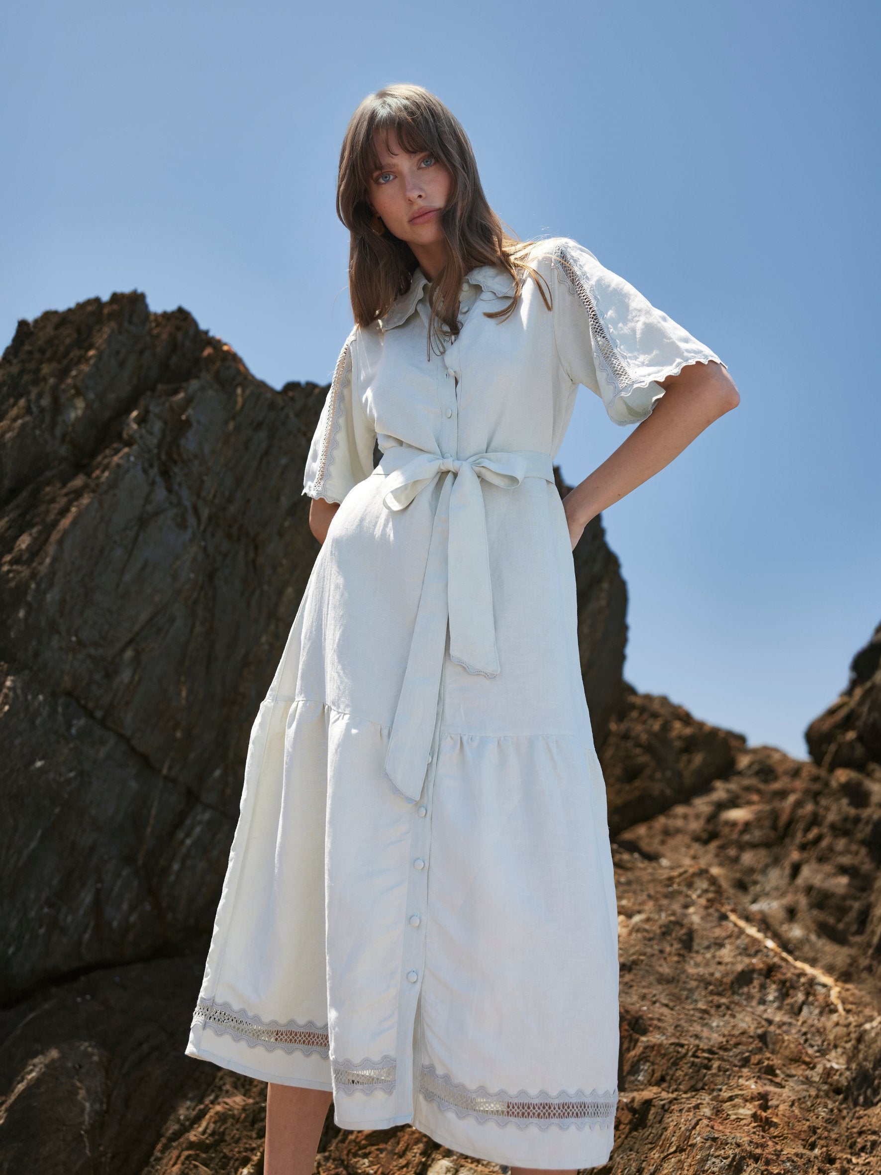 Introducing our new LOTTE Dress, modern femininity at it's best! Elevate your style with this beautiful midi dress featuring stunning lace details throughout, covered buttons & a soft, gathered hemline. To complete you look, we've added a seperate self tie belt to create even more shape.