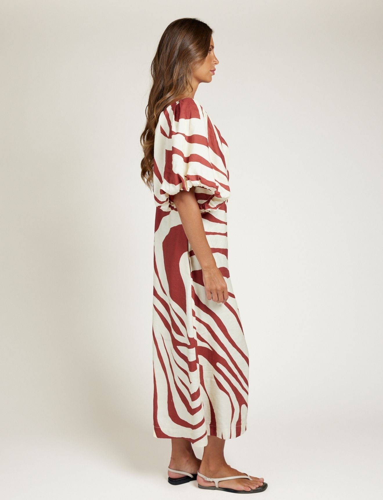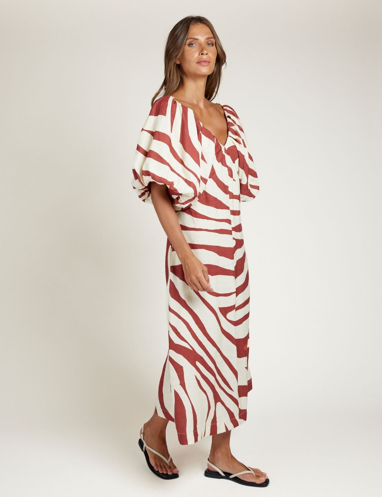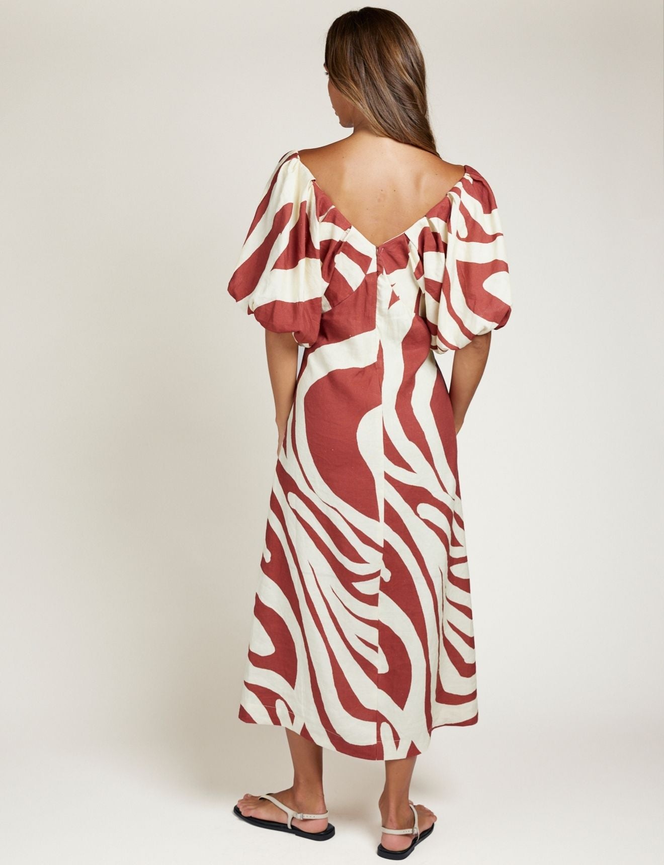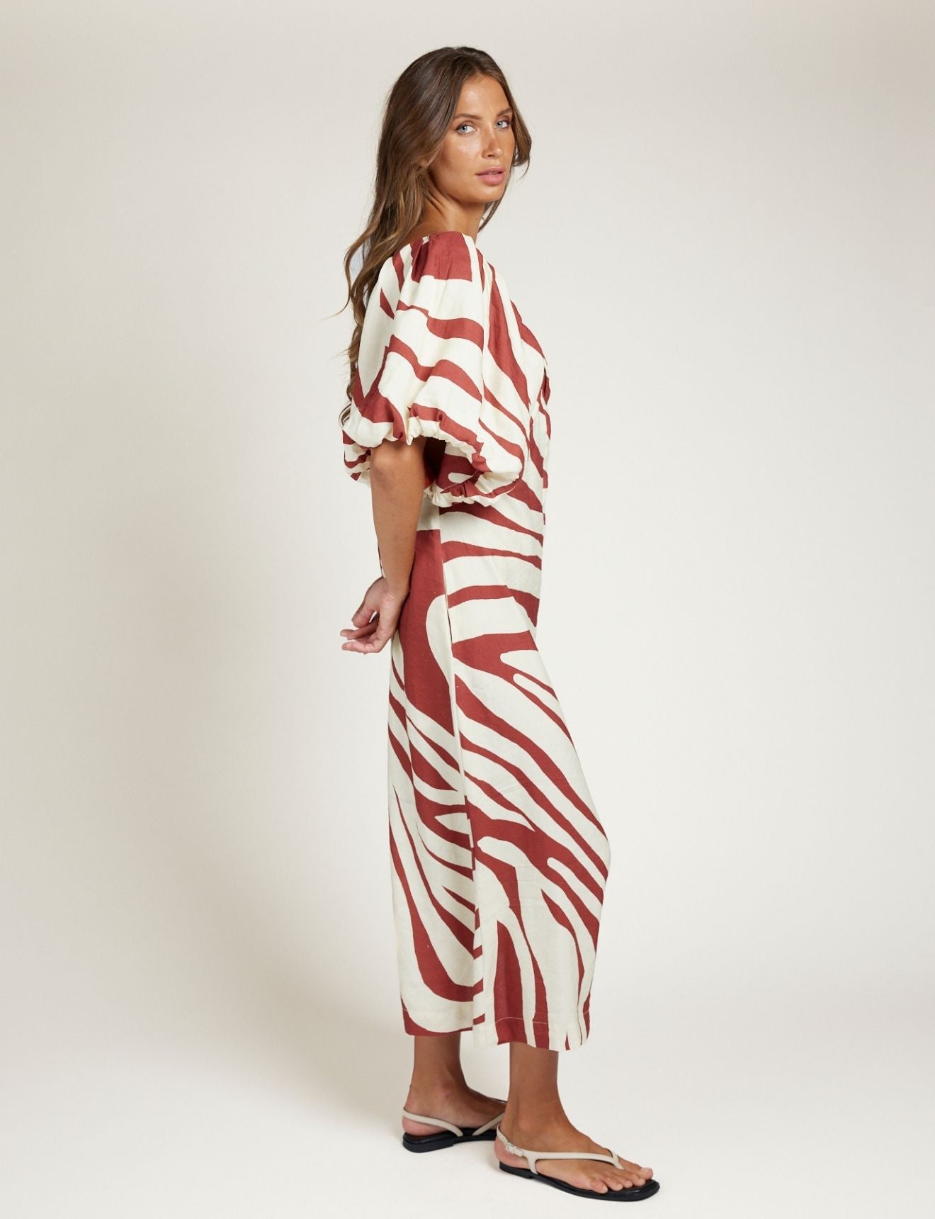 MONUMENT DRESS inj our exclusive Animalé print. Featuring a ruffled neckline & midi length. Quality & luxury workmanship is evident in every detail of this stunning piece.