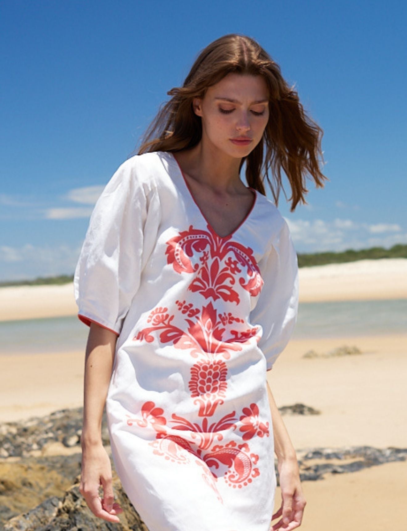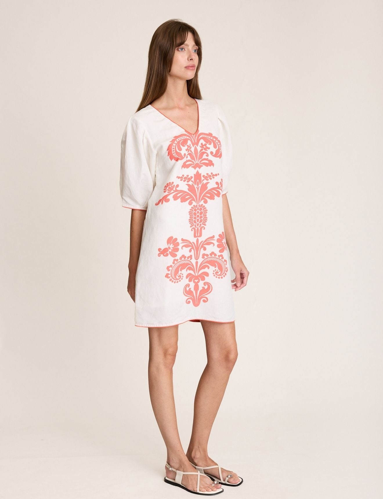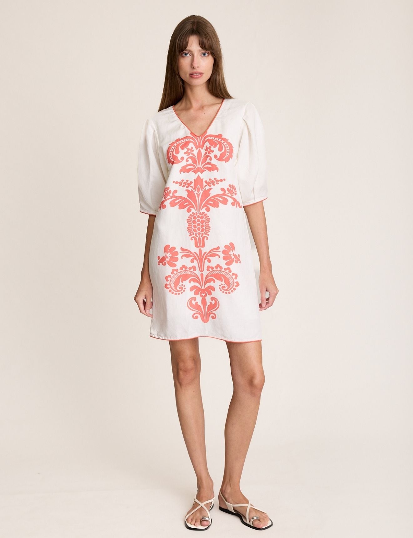Embrace the essence of summer in our PINÁ MINI Dress, featuring our exclusive PINÁ print, designed by Megs. This modern silhouette is highlighted by our signature pleated sleeves and framed with piping details on the front & back V neck & hem lines.Each detail comes together to create a playful, yet elevated piece for sun-filled occasions!